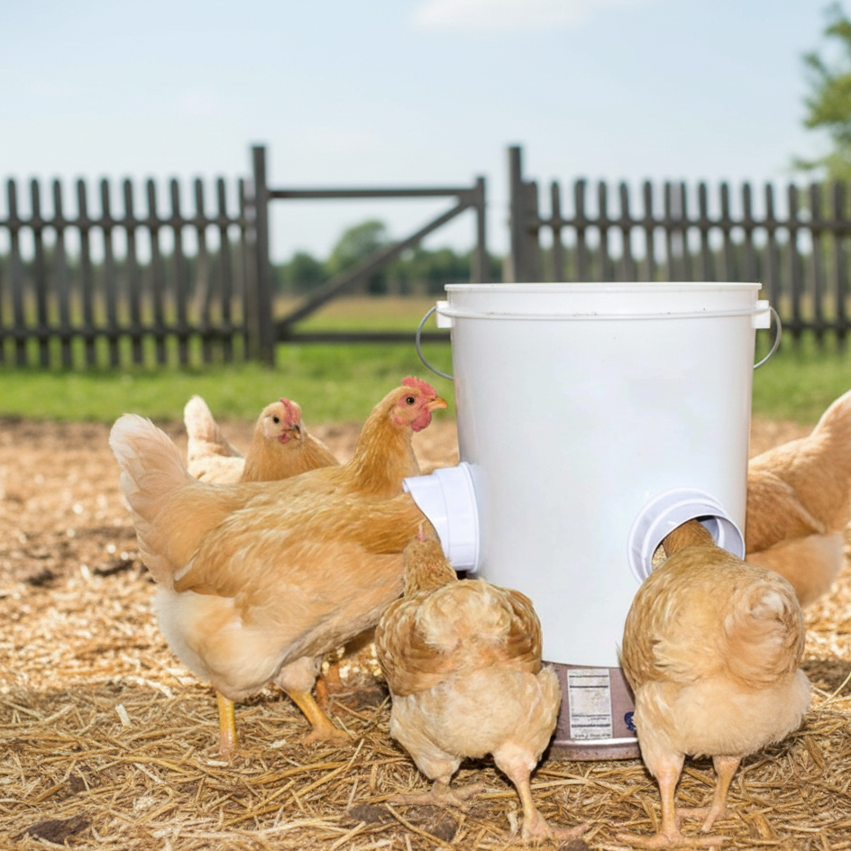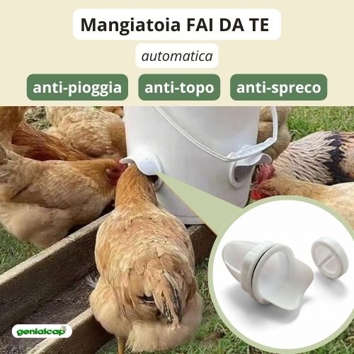 La Mangiatoia fai da te di Genialcap si adatta a tutti i contenitori: secchi, fusti e può essere utilizzata per tutti i tipi di granaglie (mais, spaccato, etc) per polli, anatre, fagiani, tacchini, faraone, pavoni, etc.